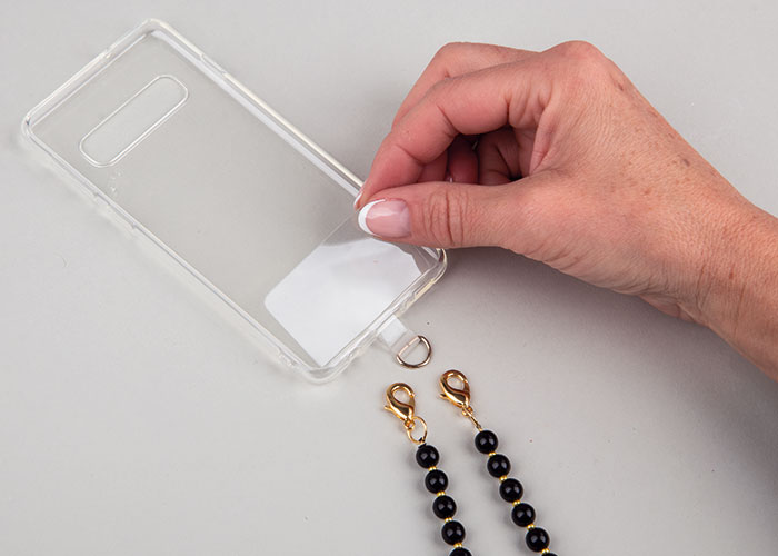 Med telefon in ovitek vstavi ploščico za pripenjanje.