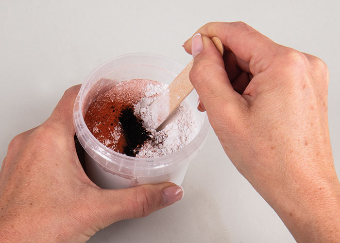 Korak 1Za nordijske hišice potrebujete tri odlitke hiške iz Raysina. Tukaj so bile dve hiški odliti s pigmenti in ena s črnim Raysinom. Za to zmešajte 300 g Raysina 200 s po 2 g pigmenta mandarina in antracit. Dobro premešajte v suhem stanju in dodajte vodo po navodilih na embalaži. Nato vlijete maso v dva kalupa za hiške. Za črno nordic hiško potrebujete 130 g Raysina 250. Pripravite maso po navodilih na embalaži in jo vlijte v kalup.