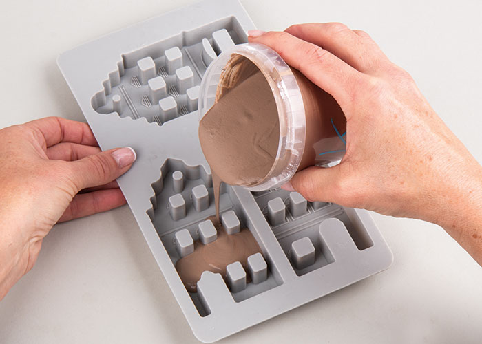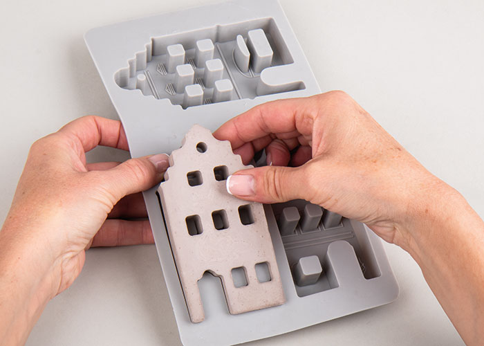 Po približno eni uri lahko hiške previdno odstranite iz kalupa. Hiške pustite, da se popolnoma posušijo še en do dva dni. Po potrebi obrusite robove na zadnji strani s brusnim papirjem.