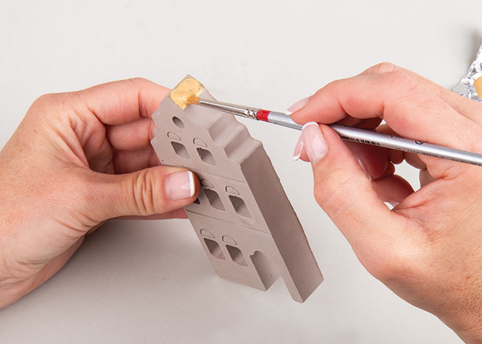 Nato pobarvajte strehe obarvanih hišk z zlatim akrilom. Pustite, da se dobro posuši.
