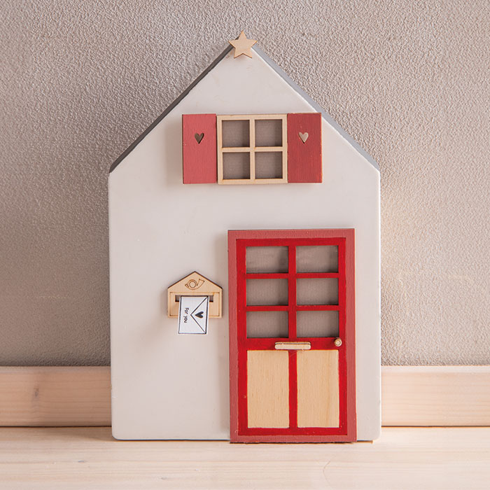 Prilepi nanjo lesena vrata in okno. Streho, vrata, okno in poštni nabiralnik pobarvaj po želji ter prav tako prilepi na hišico. Na kos papirja odtisni pismo, ga izreži in prilepi v poštni nabiralnik.
