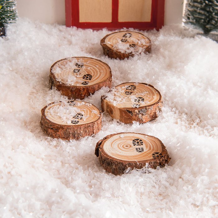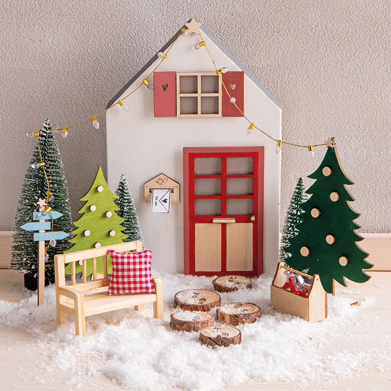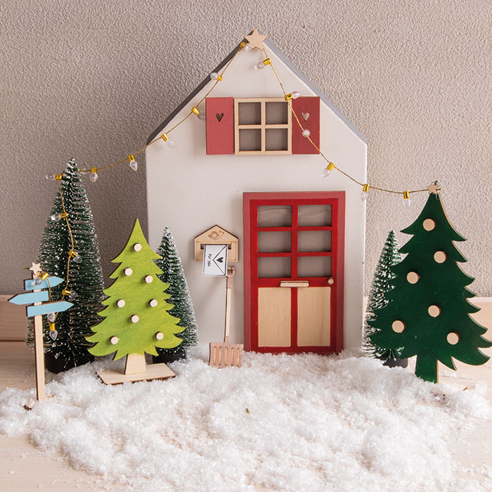 Lesena drevesa pobarvaj in okrasi, nato pa jih skupaj z drugimi dodatki za škratke in po želji z umetnim snegom razporedi okoli hišice.