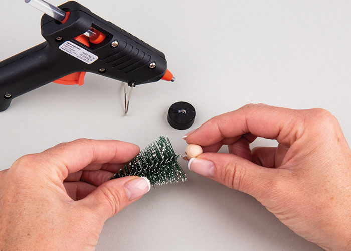 Okrasne smrečice odstrani z njihovih črnih lesenih podstavkov in jih z vročim lepilom prilepi na surove lesene kroglice.