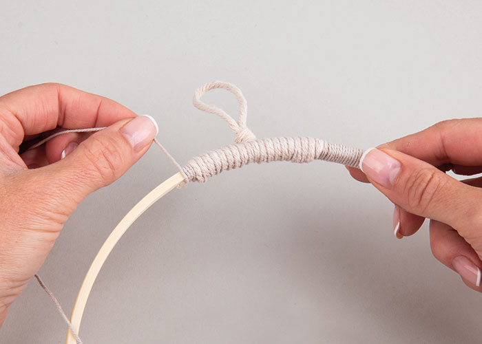 Makrame vrvico pritrdi z eno kapljico vročega lepila približno 3 cm stran od obstoječega obešalnega traku na bambusovem obroču in jo enakomerno ovij okoli obroča v dolžini približno 3 cm. Odreži konec in ga ponovno pritrdi z vročim lepilom. Enako ponovi tudi na drugi strani.
