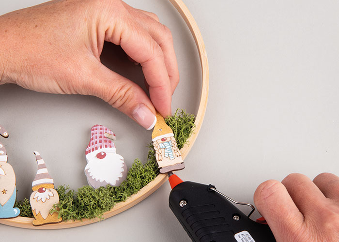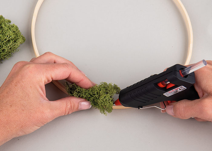 Spodnji del obroča okrasi z mahom in ga pritrdi z vročim lepilom.