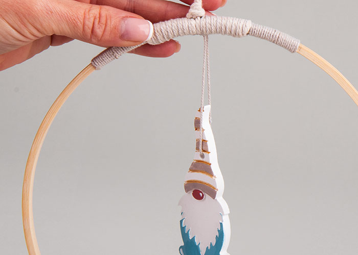 Dekorativne smrečice dodatno okrasi. Dve s pomočjo makrame vrvice obesi na obroč (pritrditev z vročim lepilom), tretjo pa pod kotom prilepi na velikega, pobarvanega škrata.