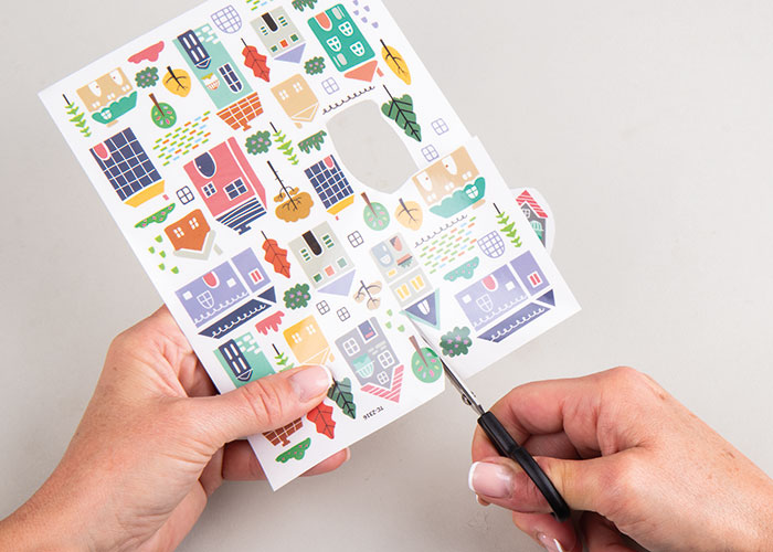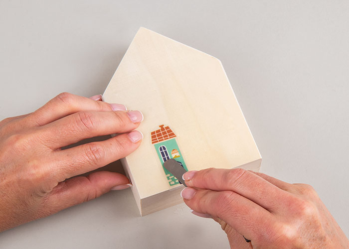 Prenesi izrezane motive enega za drugim na posušeno hiško. Najprej odstrani zaščitni papir, motiv postavi na želeno mesto in ga z nežnim drgnjenjem – na primer s topim koncem pincete – prenesi na površino. Nato odstrani zaščitno folijo.