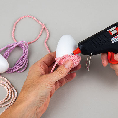 Začni z eno vrvico in konec prilepi na spodnji del stiropornega jajca. Spiralo nalepi različne vrvice navzgor. Prehode poskusi zravnati in položiti enakomerno.