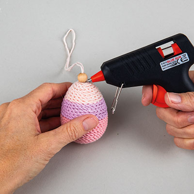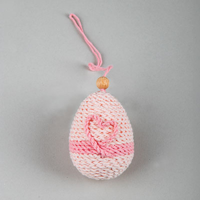 Oba konca kosa bombažnega sukanca potegni skozi leseno kroglico in ju zaveži s vozlom. Leseno kroglico prilepi z vročim lepilom na zgornji del jajca kot obesek.