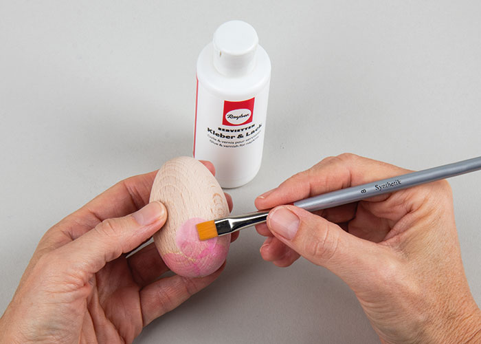 1. korakRožnate konfete prilepi nekoliko prekrivajoče na spodnjo tretino lesenega jajčka. Za lepljenje uporabi lepilo za servietno tehniko.