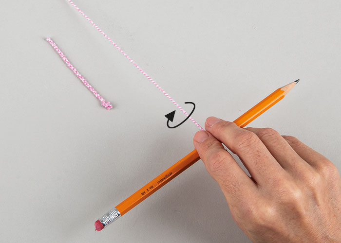 Vzemi približno 50 cm dolg kos vrvice, ga prepogni na pol in zaveži konce. En konec fiksiraj, v drugega vstavi palčko (npr. svinčnik) in pod rahlo napetostjo sukaj, dokler se nit ne začne sama zvijati. Nato pod napetostjo združi oba konca na sredini in pusti, da se zvijeta skupaj, dokler ne nastane vrvica.