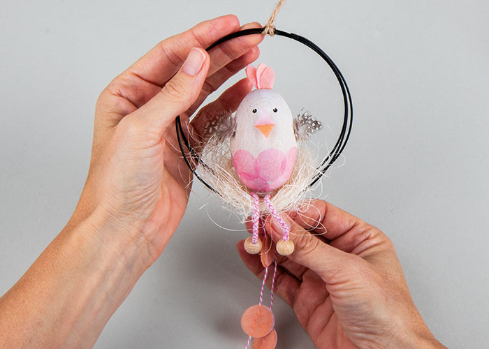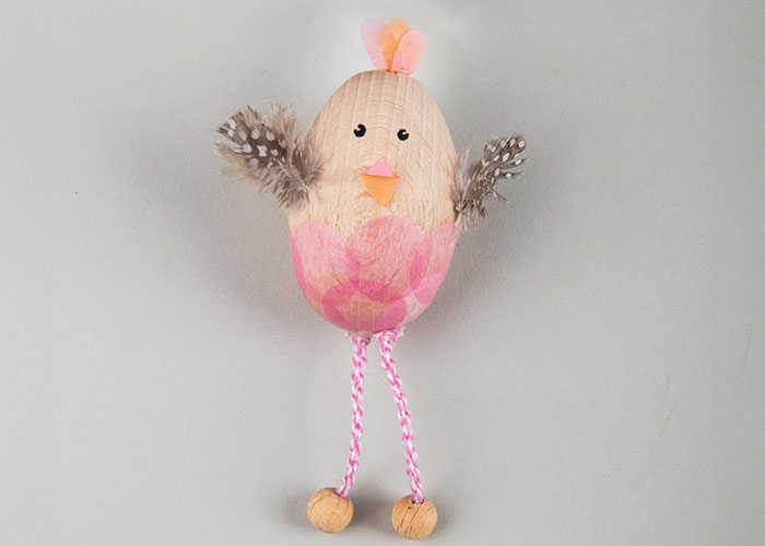 S pomočjo igle skozi vrvico potisni leseno perlico in jo po potrebi utrdi z lepilom. Nogice prilepi na jajce.