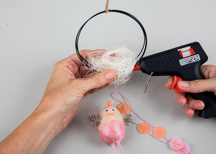 Oblikuj travna vlakna kot gnezdo in ga z vročim lepilom pritrdi na žični obroč.