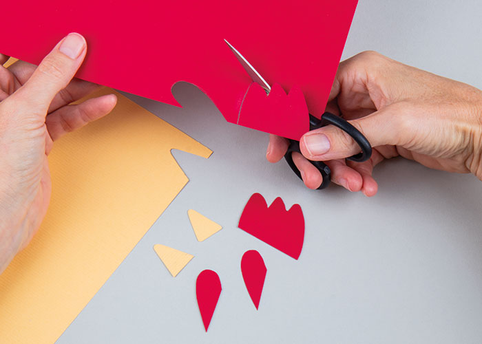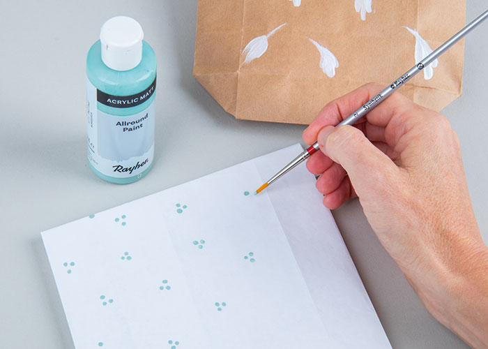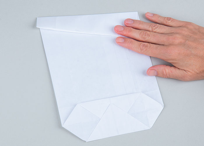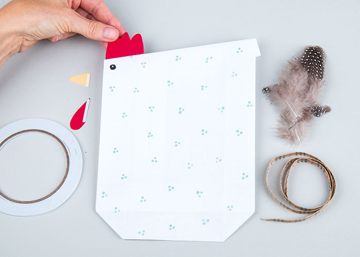 1. korak Prepogni odprtino vrečke. Izmenjuj poševne in ravne pregibe ter pazi, da so stranske stene obrnjene navzven. 2. korak Vrečke pobarvaj z akrilno barvo. Uporabi različne vzorce, na primer kokošje stopinje ali perje. Pusti, da se dobro posušijo. 3. korak Iz rdečega kartona izreži greben in podbradek, iz rumenega pa kljun. 4. korak Oči nariši s črno akrilno barvo. V vsako črno oko dodaj svetlobno pikico z belo akrilno barvo. Izrezane dele prilepi z dvostranskim lepilnim trakom, perje pa z vročim lepilom. Na koncu okoli vrečke zaveži trak.