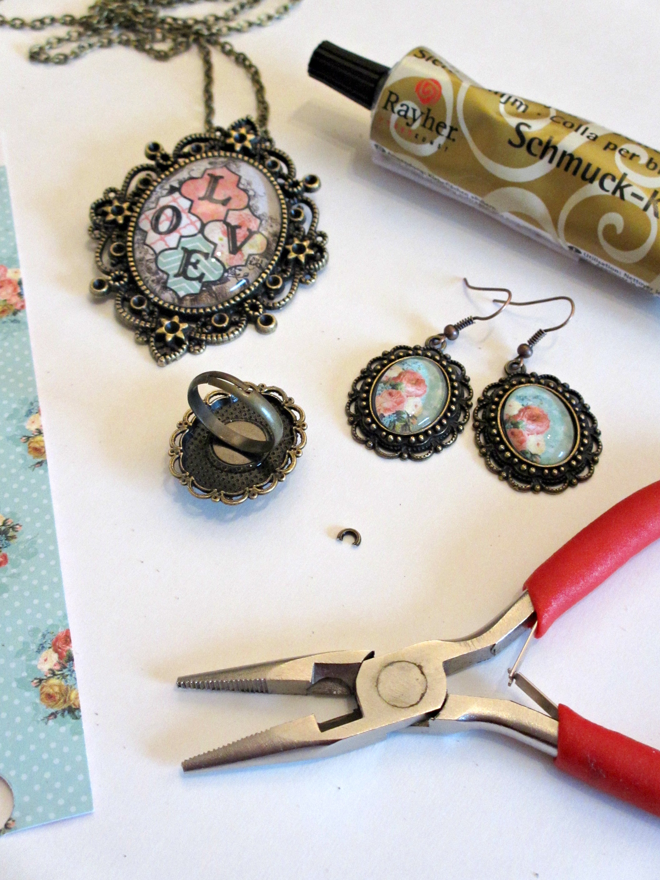 Na enak način pripravimo štiri medaljončke: enega za ogrlico, dva za uhančke in enega za prstan.