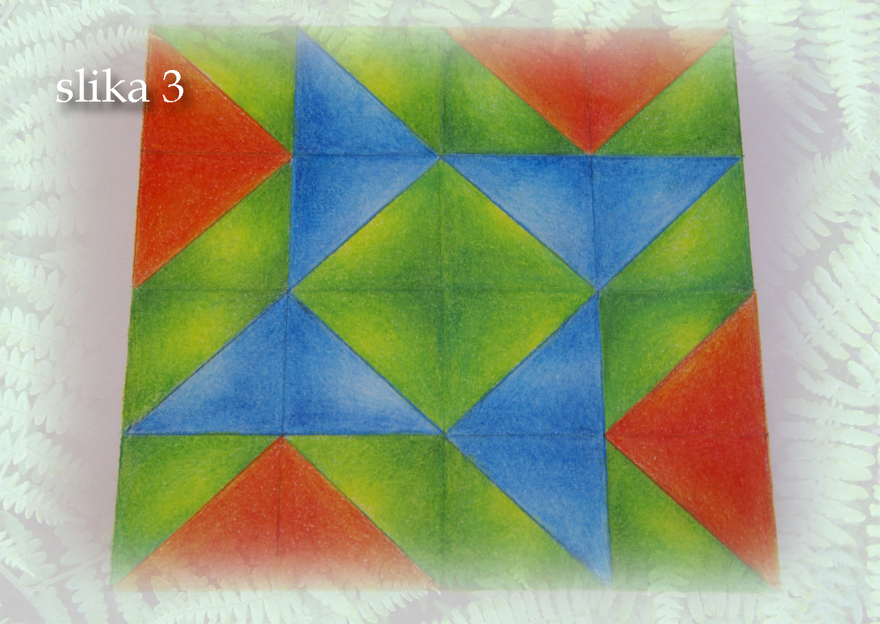 Vsakemu sešitemu delu na zadnji strani sproti razlikamo rob, tako bomo lažje šivali trikotnike in bo tudi zadnja stran izdelka lična čeprav ne bo vidna, saj bo celoten vzorec sešit skupaj s polnilom oz. medvlogo. Pri šivanju trikotnikov pazimo tudi, da šivamo robove točno, da se trikotniki v končnem izdelku lepo stikajo med seboj.