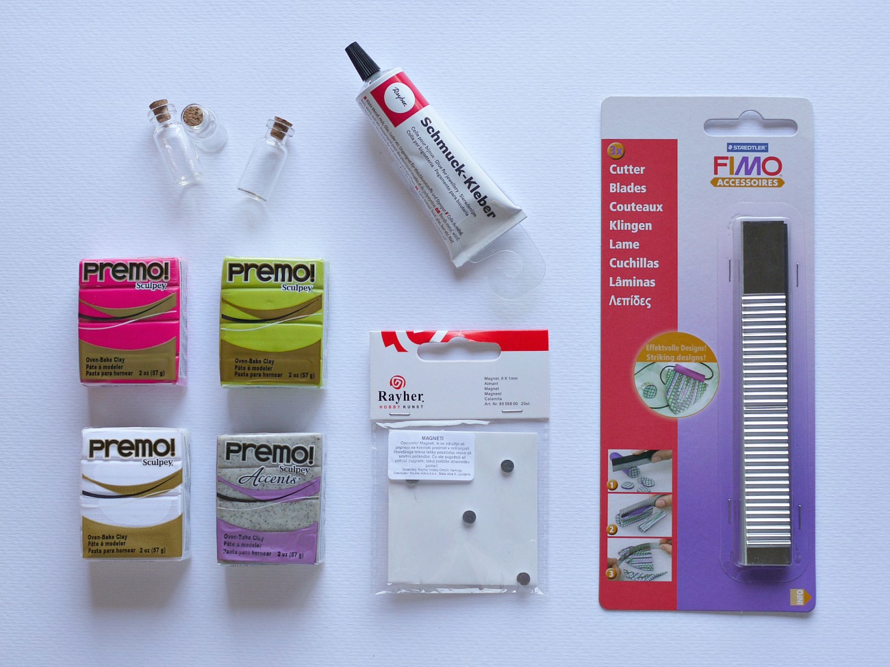 - polimerno maso poljubnih barv ( uporabimo lahko katerokoli polimerno maso Premo, Fimo, Kato, ki jo zapečemo po navodilih proizvajalca )