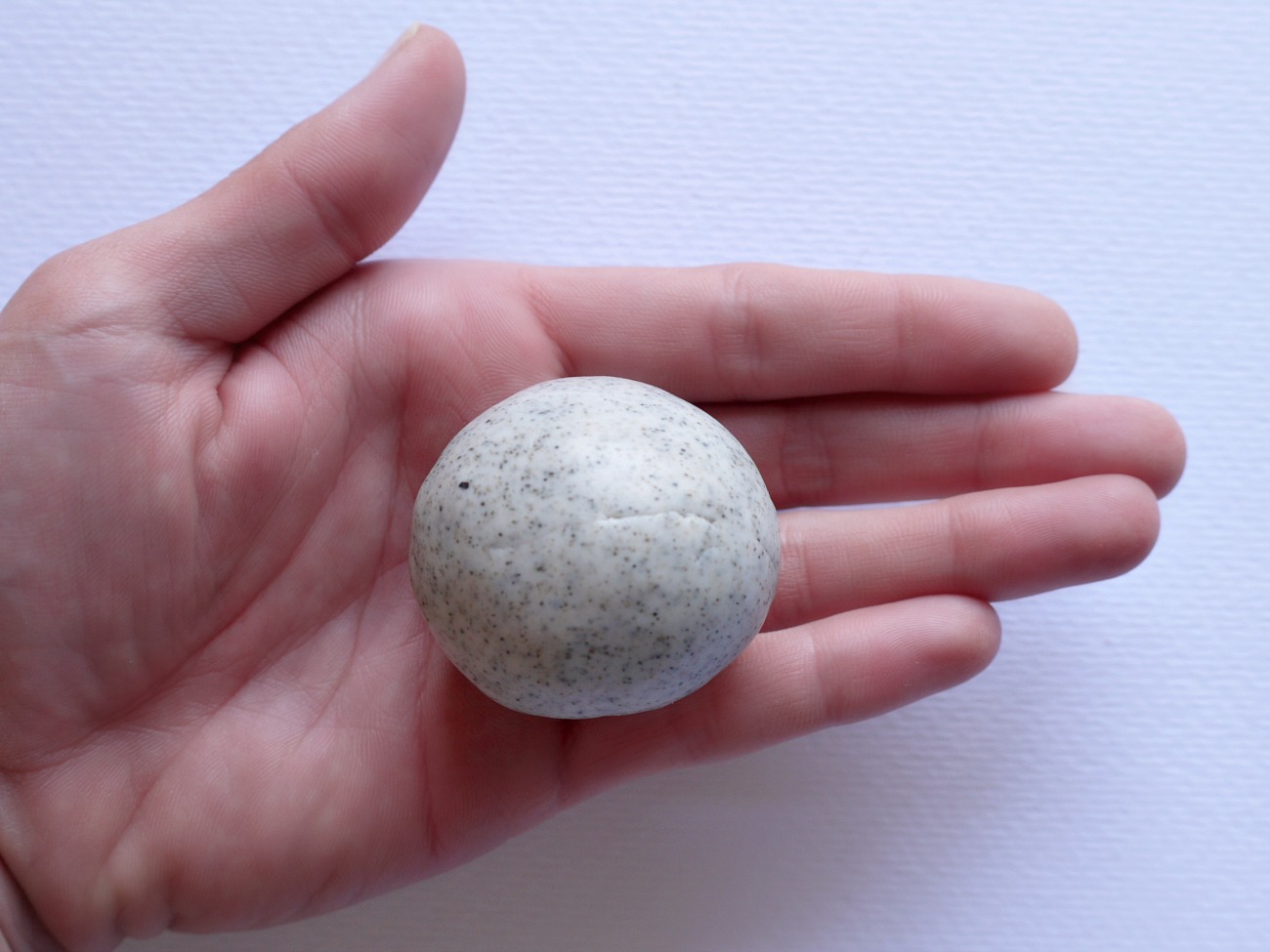 Polimerno maso najprej razvaljamo, da jo pripravimo za nadaljnje delo. Iz mase oblikujemo kroglo.