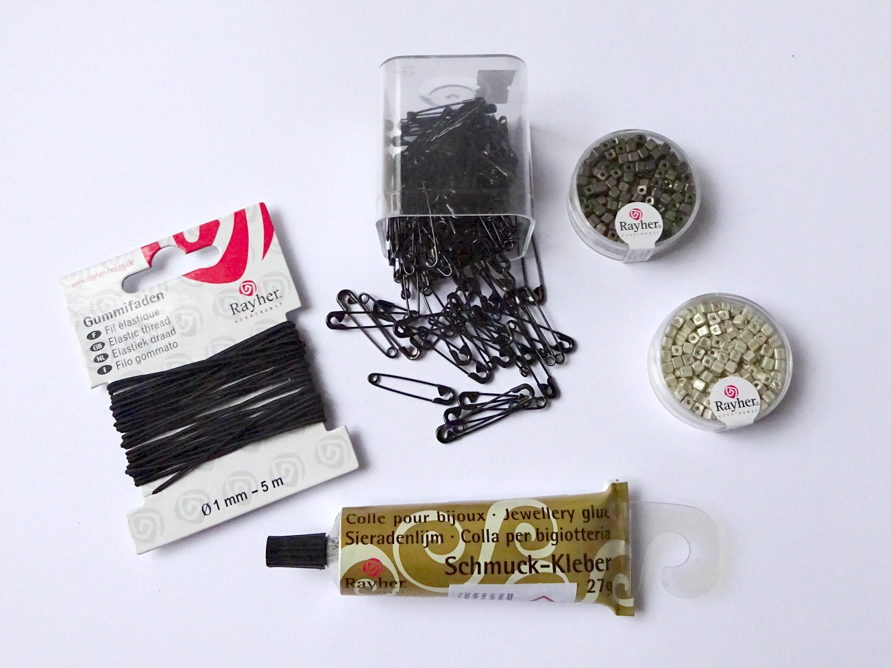 Na vsako sponko nanizamo po 5 kockastih perl. Vedno začnemo in končamo s perlo sive barve. Preden sponko zapremo, jo namažemo s kapljico lepila, da se nam sponka ne bi med nošenjem kdaj odprla in nas zbodla.