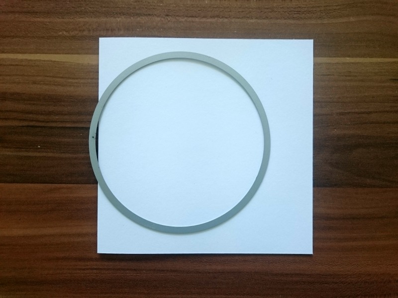 Iz belega fotokartona si pripravimo osnovo za voščilnico kvadratne oblike. Preganjeno osnovo izrežemo z največjo šablono v obliki kroga.