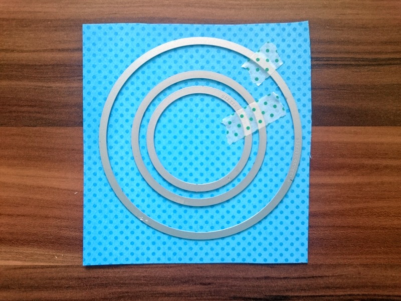 Tri manjše okrogle rezalne šablone pritrdimo z washi samolepilnim trakom kot kaže fotografija in izrežemo scrapbook karton z vzorcem pikic.