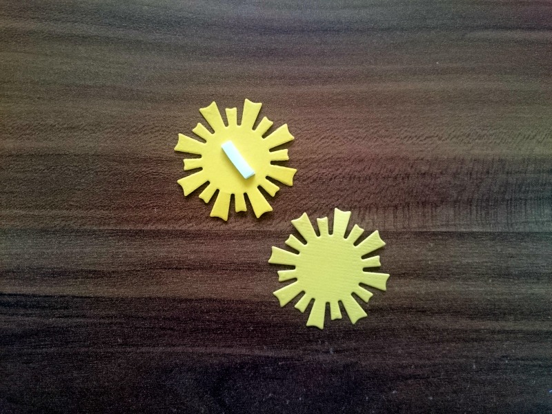 S koščkom penaste blazinice (2×2 mm) zalepimo skupaj dva kovanca. Enako velik košček prilepimo tudi na vrh enega od kovancev, nanj pa pritrdimo sonček.