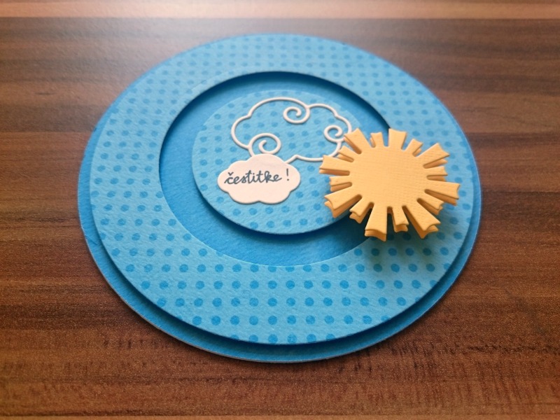 Z isto šablono izrežemo tudi krog iz scrapbook kartona in ga z lepilom za papir prilepimo na lice bele osnove.