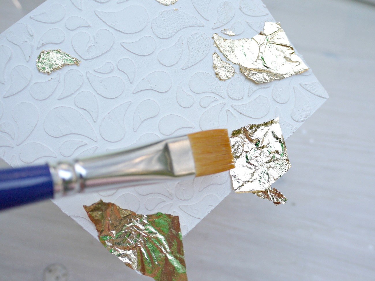 Počakamo približno 20 minut in nato s čopičem previdno odstranimo odvečne kose zlatega lista.